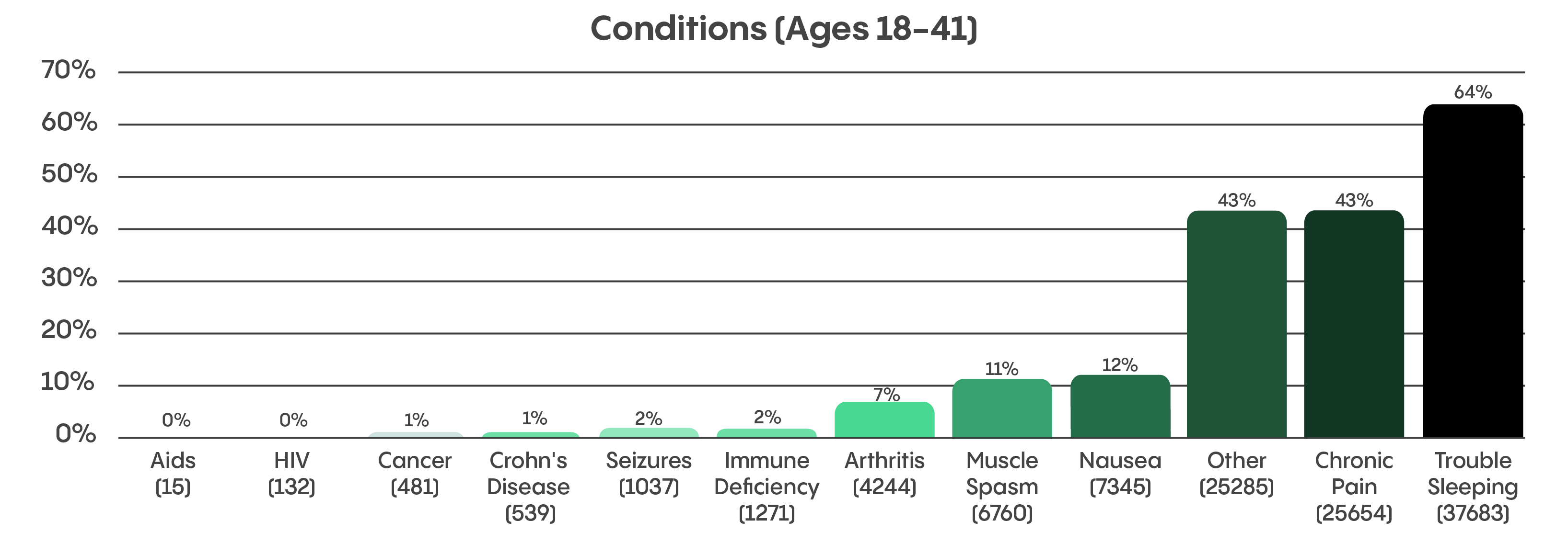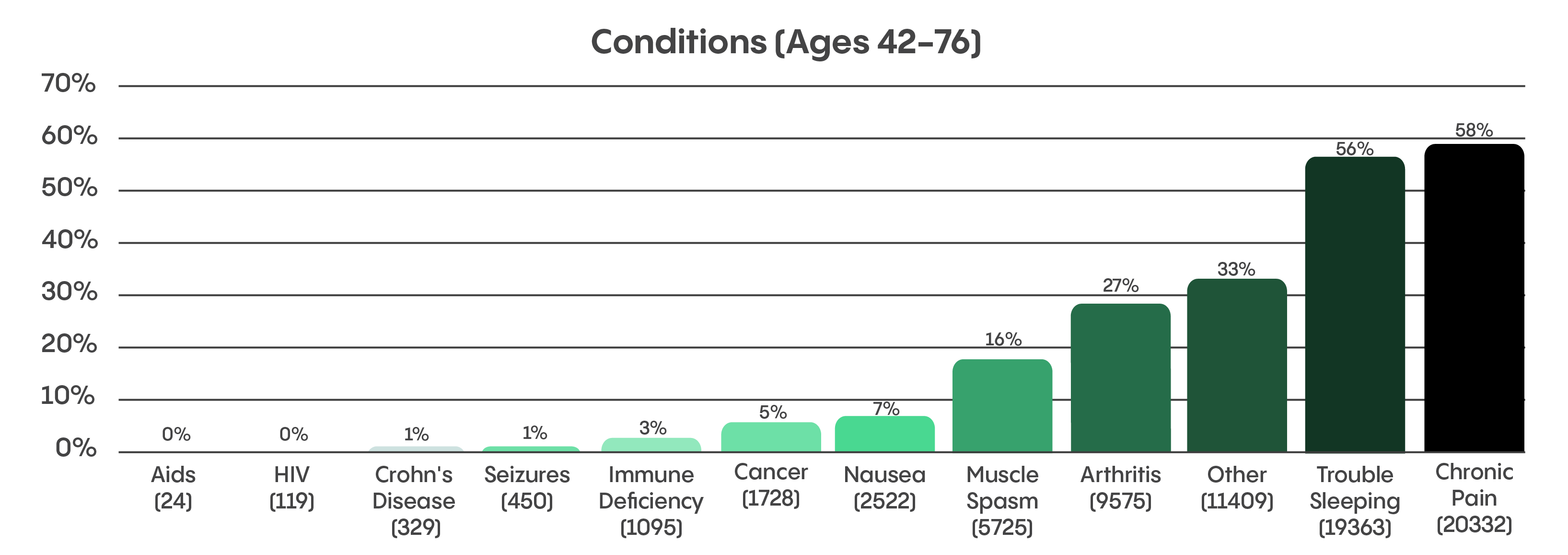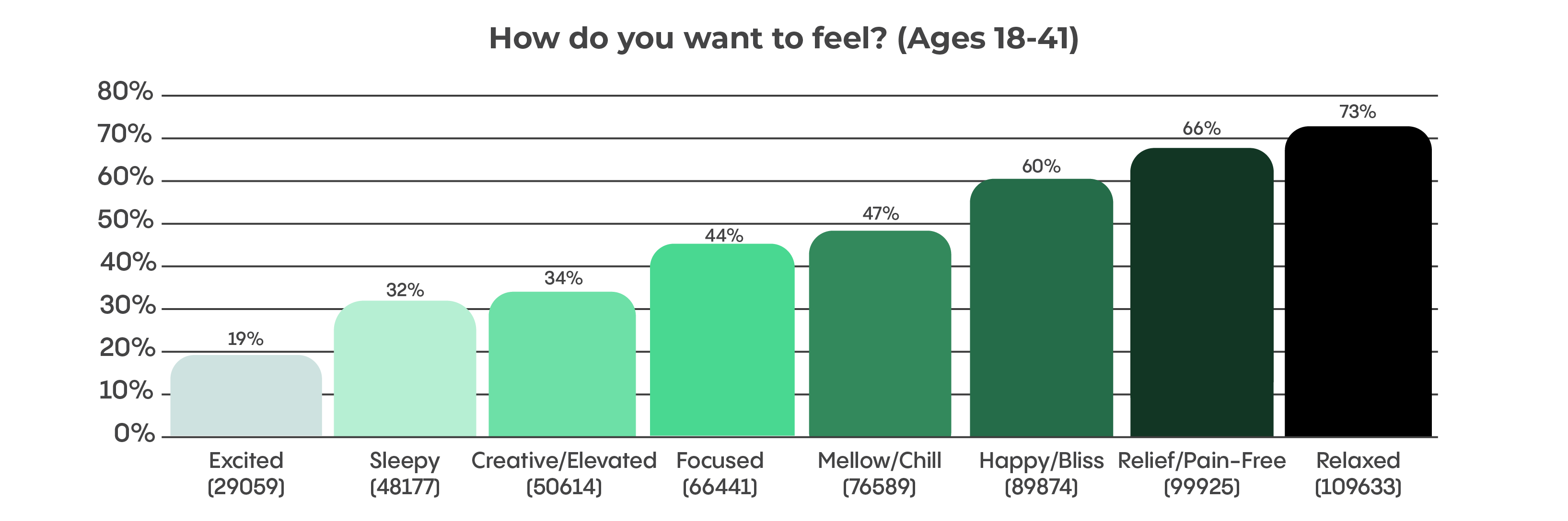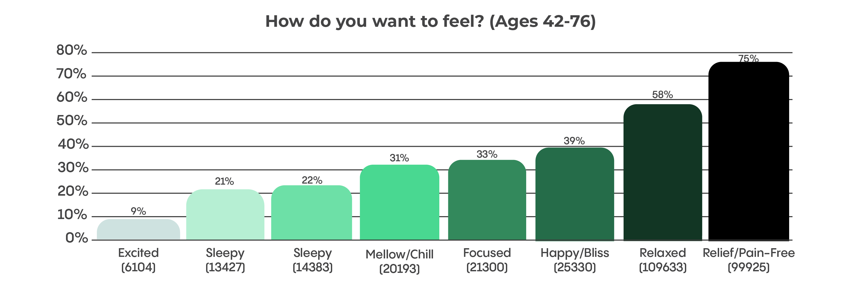 When asked what conditions they used medical cannabis for, the majority of older patients (58%) reported chronic pain compared to just 43% of younger patients. The second-most reported condition among older generations was trouble sleeping (56%). This information is reflected in older patients’ responses to the question “How do you want to feel [after cannabis consumption]?” Most (75%) reported a desire to feel pain-free, followed by 58% wanting to feel relaxed.