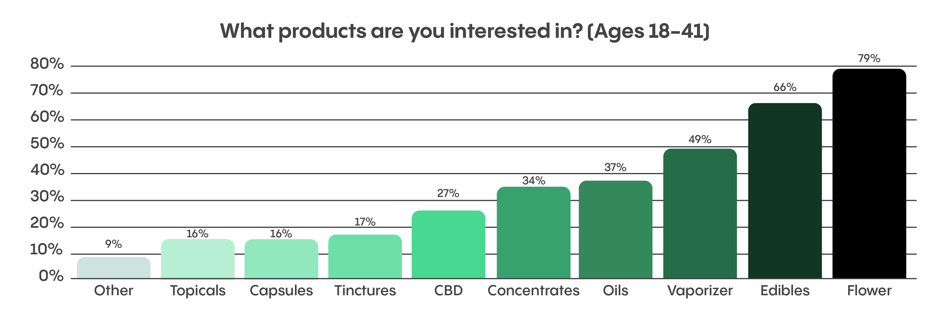 The preference for flower consumption in younger individuals has been observed across many regions for years. The majority of younger survey respondents (79%) reported flower as the cannabis product they were most interested in, demonstrating younger generations’ gravitation toward inhalable, faster-onset products. This is also reflected in younger patients’ higher interest in concentrates (34%) compared to older patients (19%).