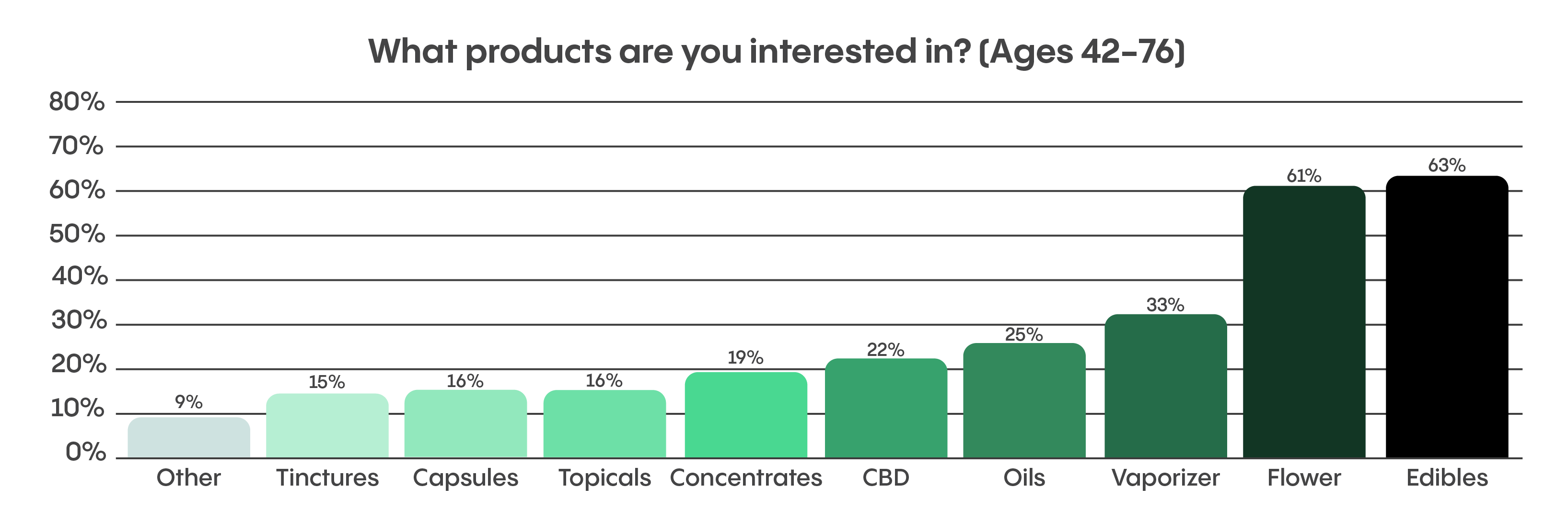 Social stigma and harm reduction also appear to factor into older generations’ preference for edibles over other products. A 2016 study showed that older consumers were concerned about long-term lung damage due to smoking, which may explain their slight preference for edibles to flower. Older patients also displayed an aversion to concentrates, likely due to the difficulty of consuming them safely and the stigma surrounding their use.